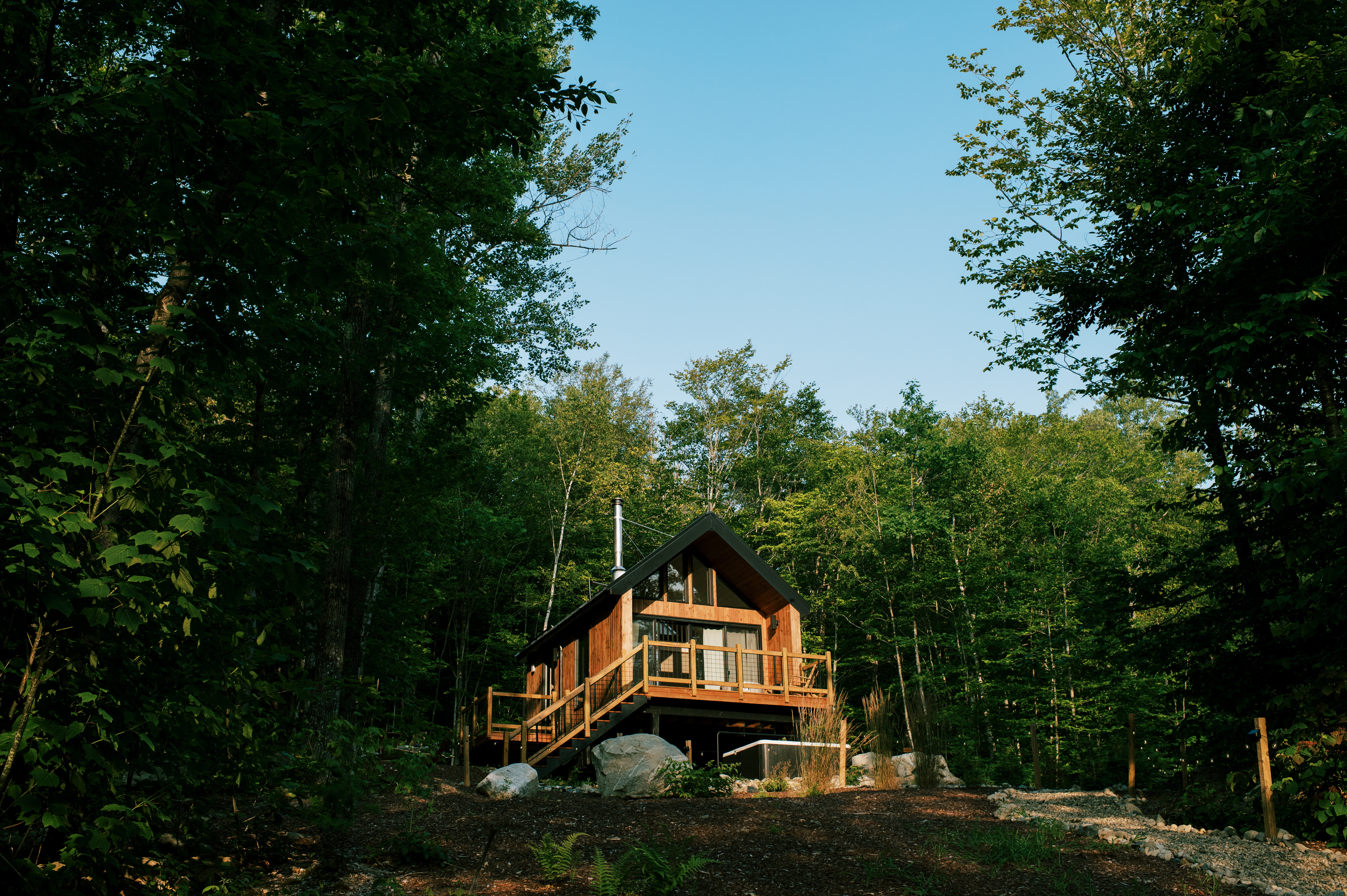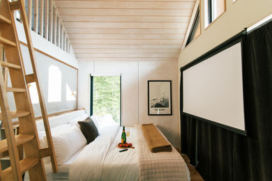 Exterior: Nestled in a tranquil woodland, these Scandinavian cabin are an eco-conscious haven built into the hillside using innovative architectural practices to minimize land disturbance. The natural wood facade seamlessly blends with the forest, and the gently sloping roof integrates the cabin into the landscape. Floor-to-ceiling windows offer stunning views of the surrounding greenery and flood the interior with natural light. Each cabin is private and secluded, ensuring a peaceful retreat.